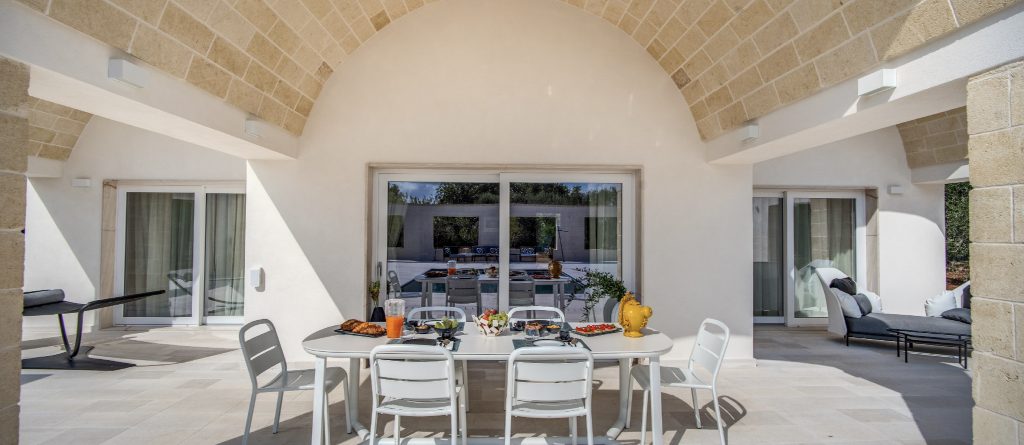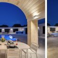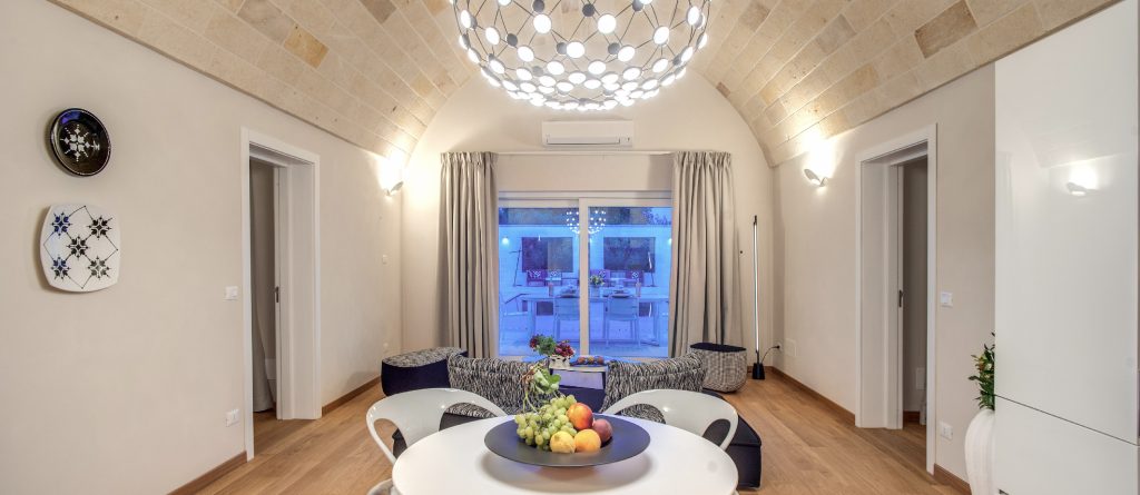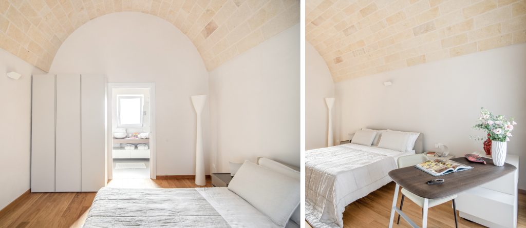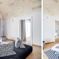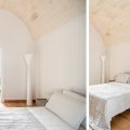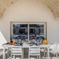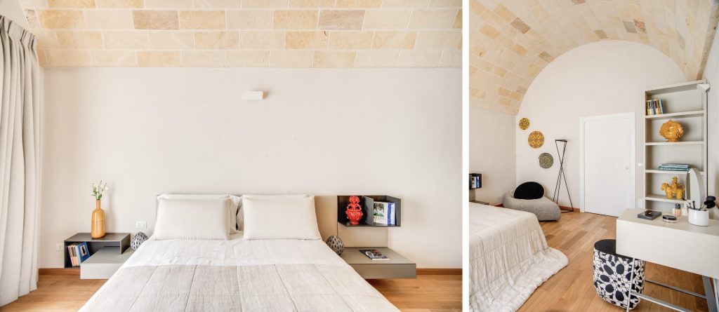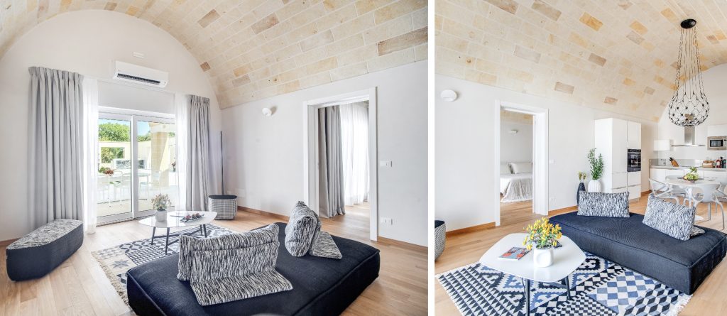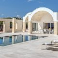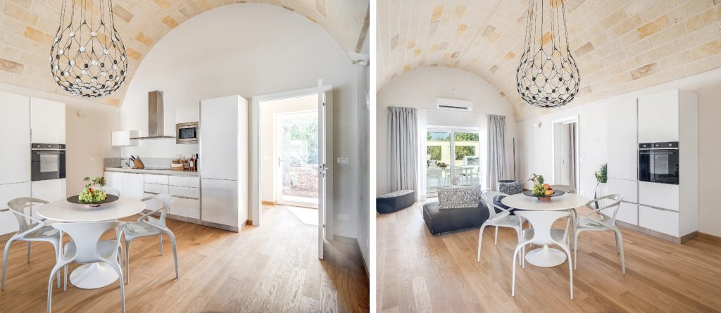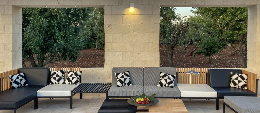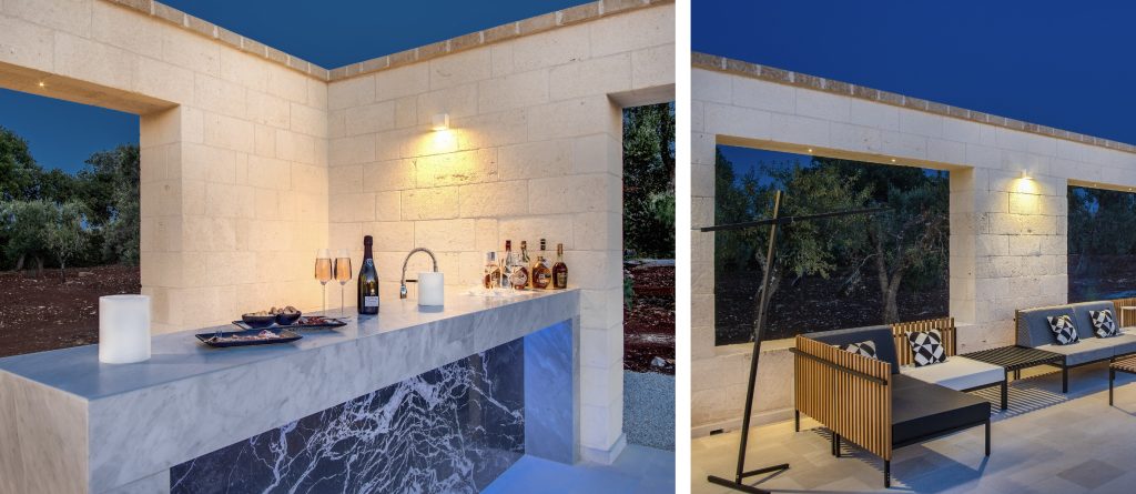 A meticulous homage to history and heritage, the design of this single-level abode is a fusion of modern trends and traditional influences. The interiors showcase exposed stone walls and exquisite wooden floors, evoking a sense of rustic warmth that harmonises effortlessly with the landscape visible from nearly every angle. Elements of classic Apulian architecture, such as arched ceilings and white stone, are combined with contemporary touches, like the modern design furniture.