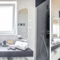 There are two bedrooms with air conditioning throughout, and ensuite large showers – one double (King 180 cm by 200 cm) with an ensuite large shower and a second double (Queen 180cm by 200cm) with the option of a single beds too. Extra cribs are available upon request.
