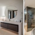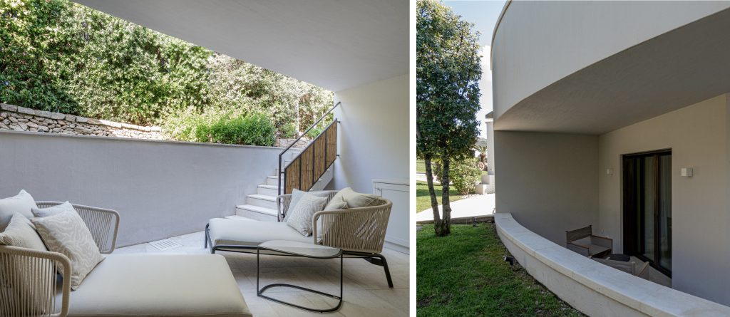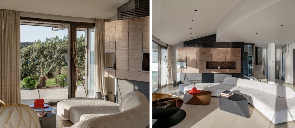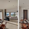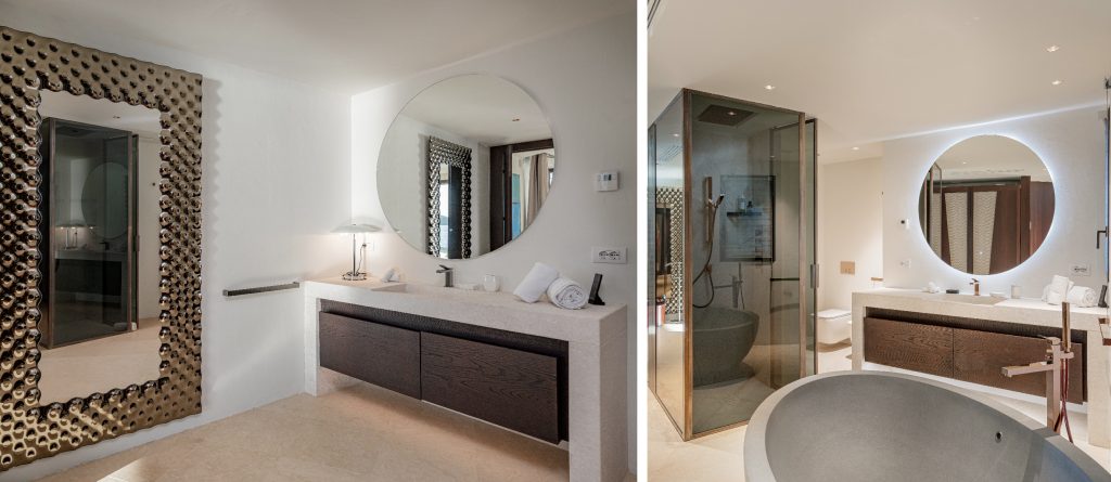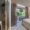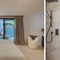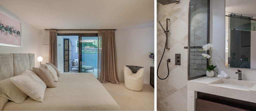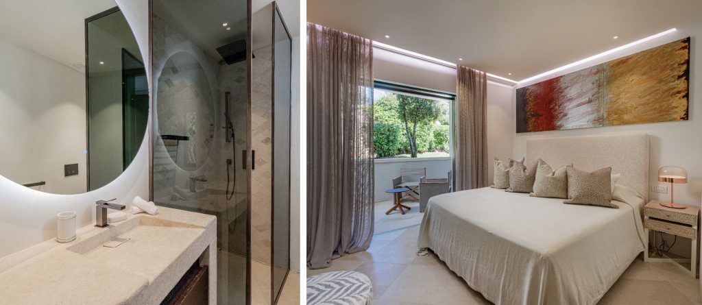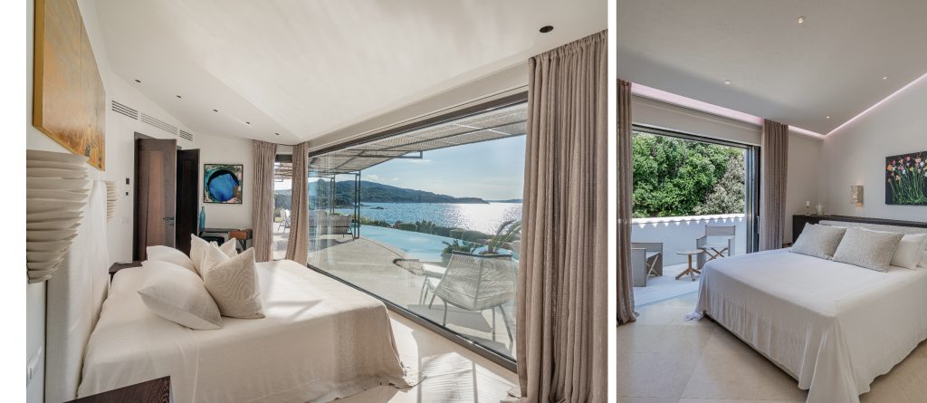 To the right of the living area, the main sleeping quarters include four luxurious suites. The main floor features the master bedroom with an impressive sea view, wardrobe, open bathroom with a tub and shower, and a private terrace. Another double bedroom with an ensuite bathroom and private terrace is also located on this floor. Upstairs, there are two additional double bedrooms, each with its own bathroom and private balcony. At the highest point of the house, you’ll find the panoramic area, perfect for soaking in the stunning vistas.