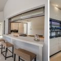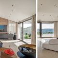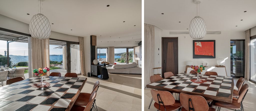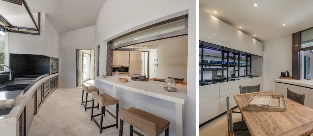 Stepping inside the main entrance, you are welcomed by a spacious living room with expansive windows that offer breathtaking sea views. Adjacent to this area is a dining space that comfortably seats eight. The internal kitchen is to the left, and just outside, a professional kitchen used by the chef is available.