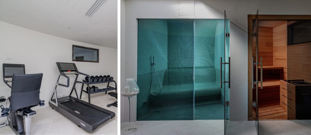 The lower floor is dedicated to relaxation and wellness, housing a spa with a sauna, hammam, fitness area with the latest equipment, and a bathroom. This floor also includes a separate staff area with independent access, consisting of a laundry area, a single bedroom, and a bathroom with a shower.