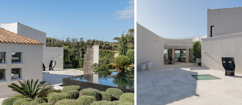 In front of the living room, a furnished terrace and another swimming pool facing the sea await. This pool features two hydromassage loungers, perfect for relaxation. Adjacent is a covered dining area with a table that seats 12, ideal for al fresco meals.