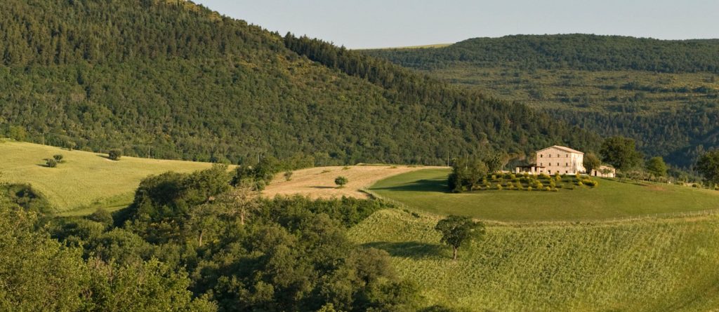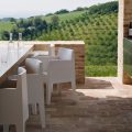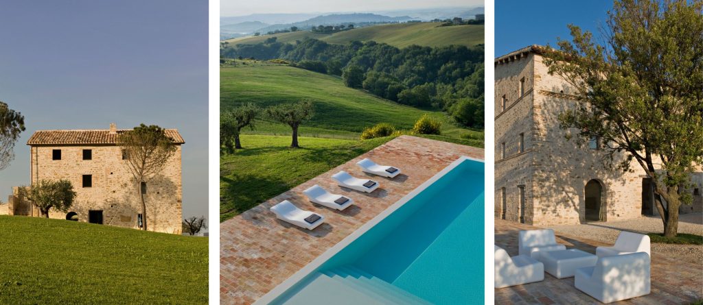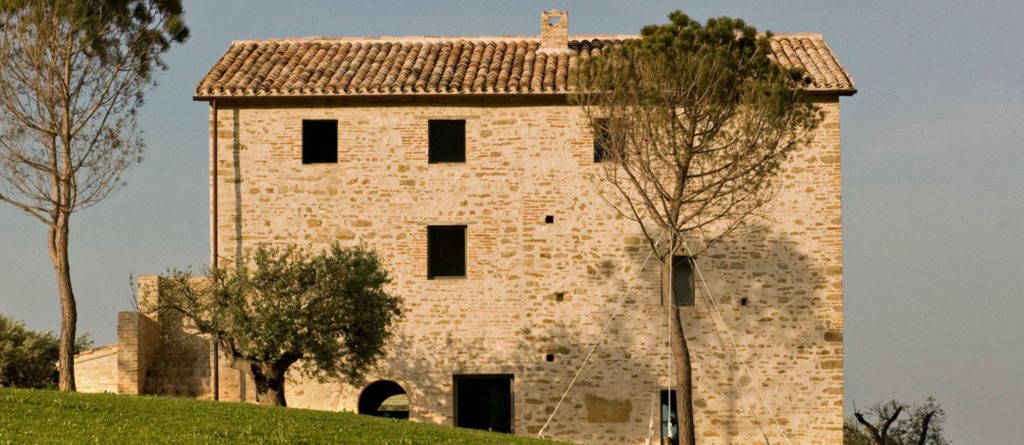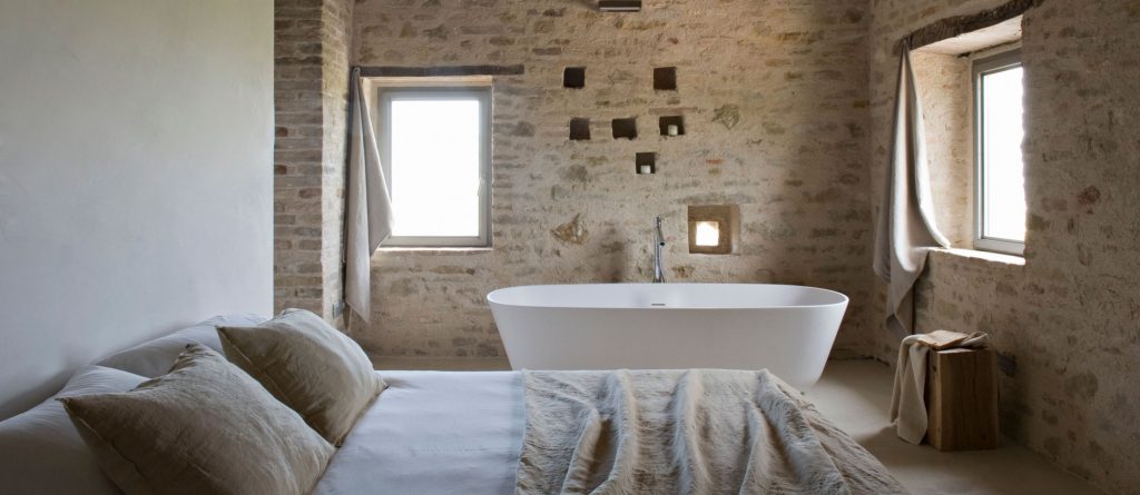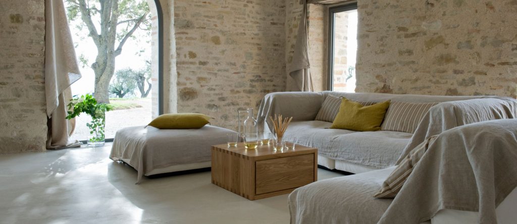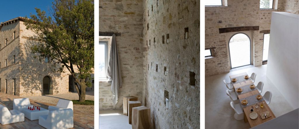 Thick stone walls, terracotta tiled floors, exposed oak wooden beams and a fireplace. Minimalist Marche is located in a panoramic position in the countryside near the mediaeval town of Treia and offers privacy and independence.