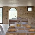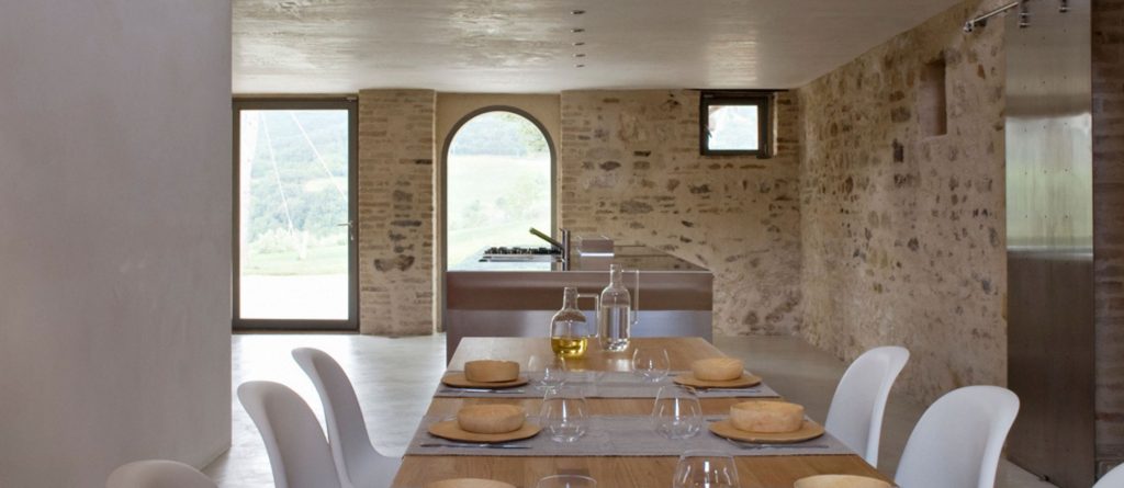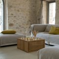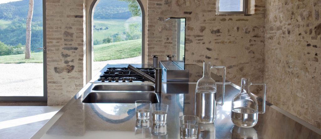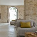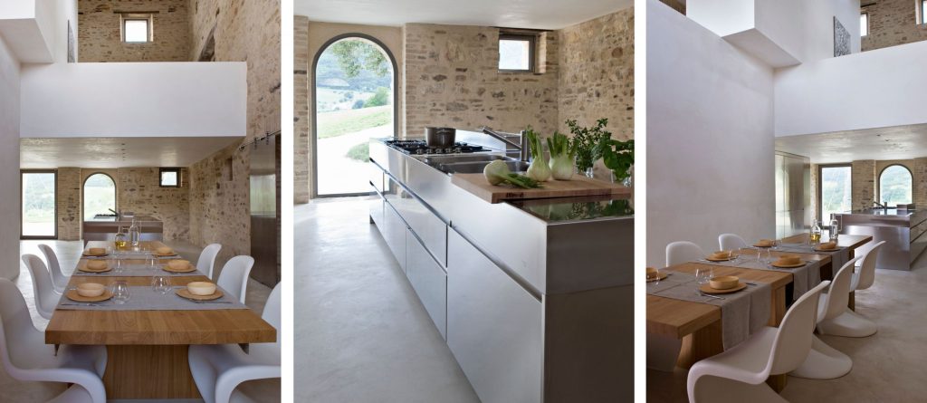 The design has been thought through with research on its history, resulting in a minimalist style with washed wooden boards while wood-beamed ceilings lend a rustic feel to the interiors. Elements of classic Italian residential architecture, such as the wall exposed in rocks and bricks, are combined with contemporary touches, including steel in the kitchen and resin floors. Trendy yet very comfortable, this is a chic retreat full of light and a welcoming vibe, blending traditional and modern Italian architecture.