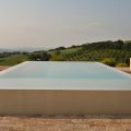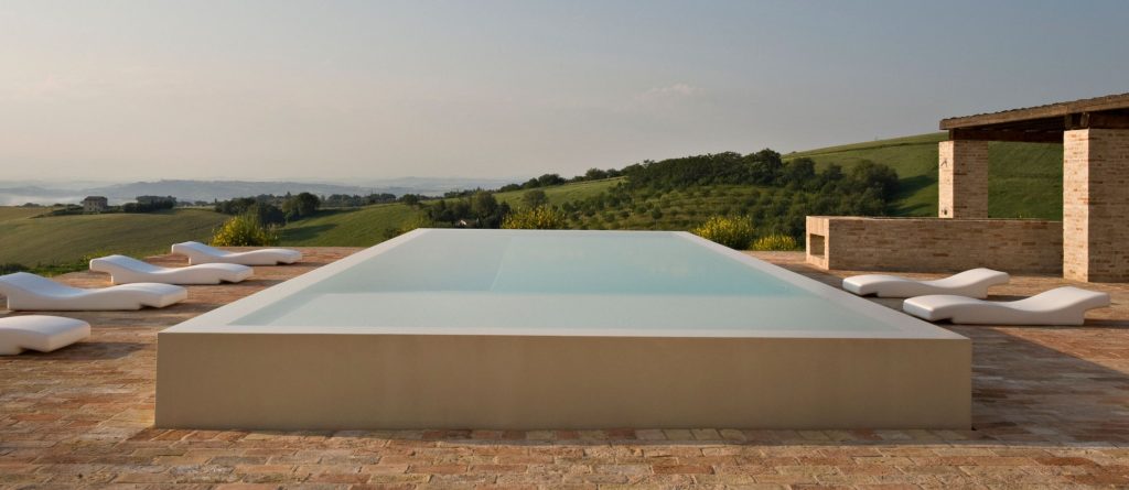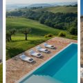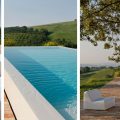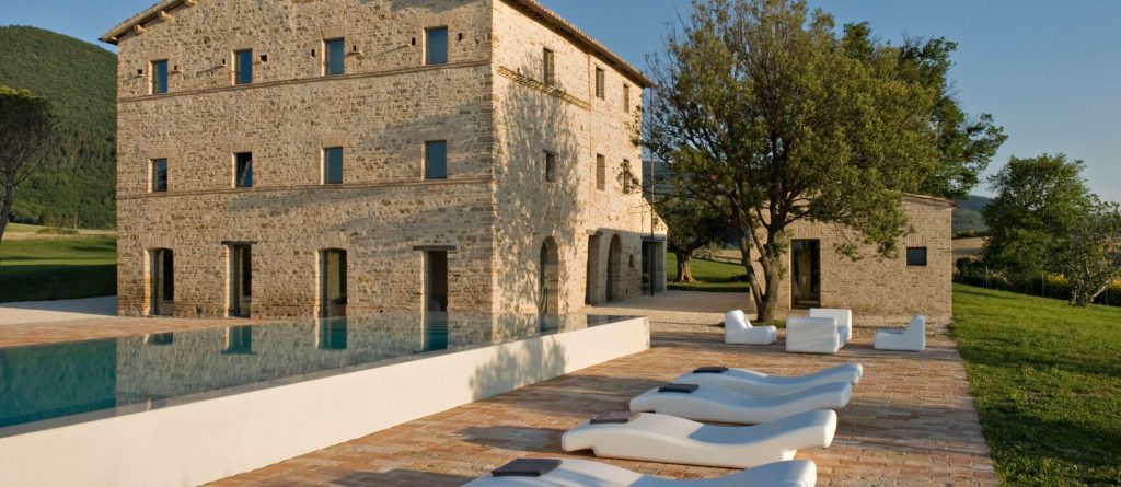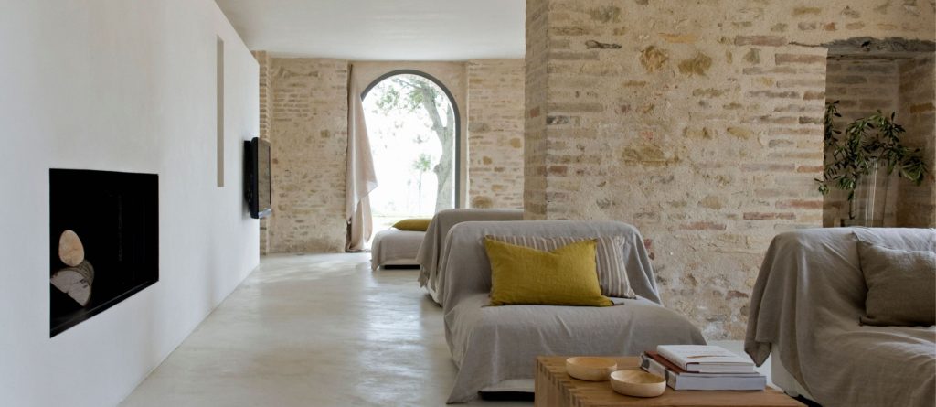 Thick stone walls, terracotta tiled floors, exposed oak wooden beams and a designed fireplace. Minimalist Marche is a five-bedroom house located in a panoramic position in the countryside near the mediaeval town of Treia offering both privacy and independence.