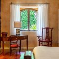 - A short descent leads to Archi, a generously sized deluxe double chamber showcasing an alcove sleeping space, an en-suite bathroom appointed with a tub and separate shower, and a shaded terrace that opens up to the gardens.