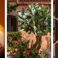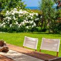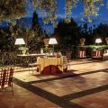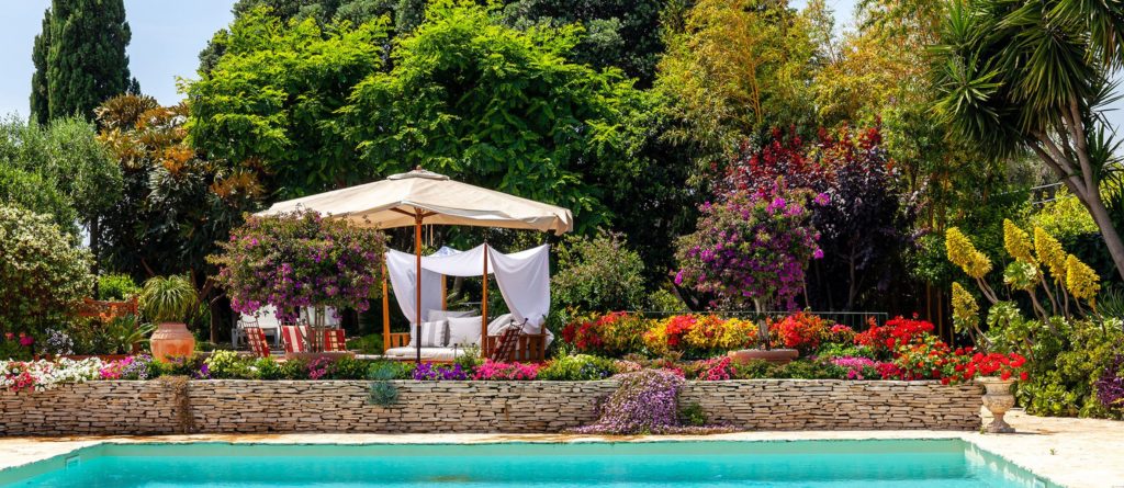 The enchanting gardens captivate with their vivid colors and delightful design, drawing inspiration from the Arabic belief that gardens should evoke delight and wonder. Expansive terracotta terraces radiate in various directions, each thoughtfully furnished for relaxation or stylish dining. Lava stone steps wind past meticulously maintained lawns, a petite olive grove, fragrant Mediterranean blooms, and an eclectic array of mature trees, ultimately leading to the panoramic Jacuzzi and the invitingly heatable pool, encircled by flourishing, lush greenery.