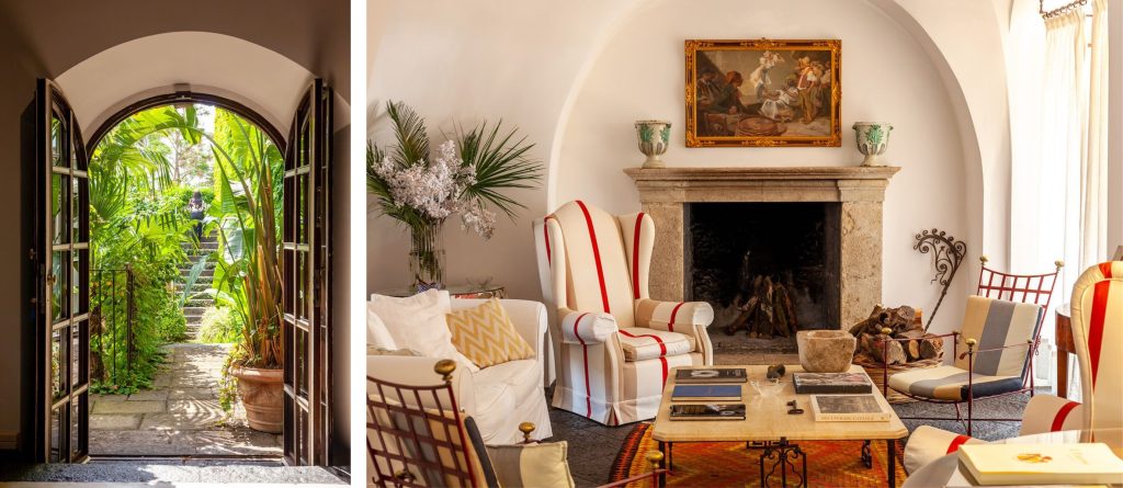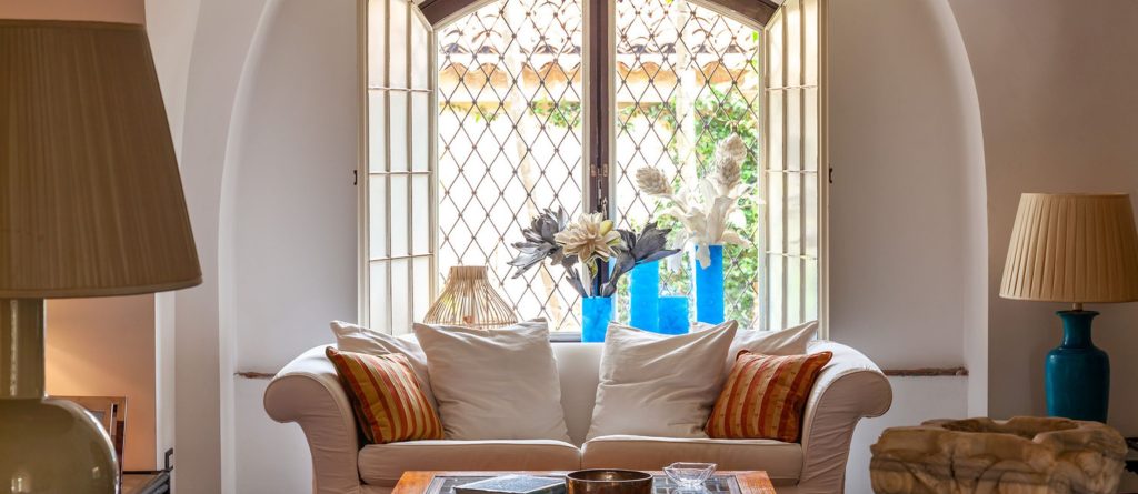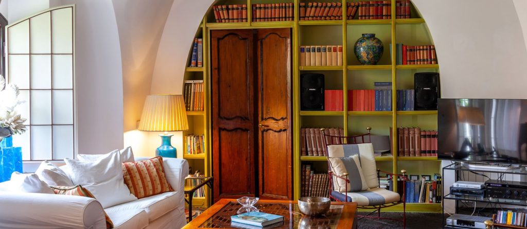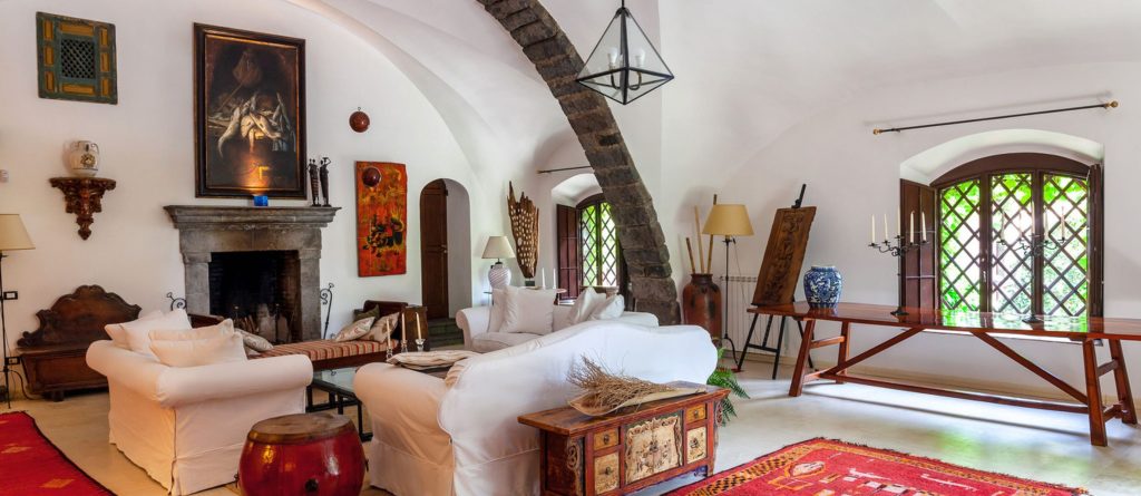 To the right of this, a few more steps lead you to you a generously proportioned, exquisitely furnished living space. Sink-in sofas and comfortable armchairs gather around a deep-seated fireplace on one side, while to the other is a second sitting area with TV. Distinguished grey lava stone floors contrast against vibrant kilim rugs; the white walls and soaring vaulted ceilings showcase an array of art pieces and paintings; the furnishings embody an aesthetic of effortless elegance, and expansive glazed doors seamlessly extend to the encircling terraces and gardens. The ambiance harmoniously blends refinement, casual ease, warm hospitality, and luminosity, all characteristics that define The Magic Garden.