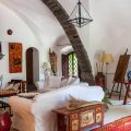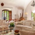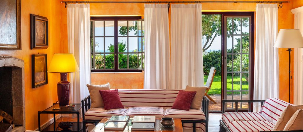 The remaining accommodation is within the luxuriously renovated guesthouse that mirrors the refinement, elegance and overall style of the villa. Positioned just a short stroll through the gardens from the villa the main entrance leads into an airy, inviting living space with a fireplace. Whitewashed wood-beamed ceilings offset the colorful walls and the kilim-covered terracotta floors, with views of the gardens and the sea. A broad hallway lined with windows overlooking the terraces and gardens extends from this area to four bedrooms.