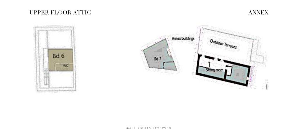 Bedroom 7 is located in the annex building, providing a separate space for guests. It features a queen bed and a walk-in shower. Additionally, there’s the option to include a sofa bed, adding flexibility for sleeping arrangements.